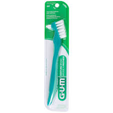 Gum Dental Brush - szczoteczka do protez. Płaskie przycięcie włosia i solidna konstrukcja zapewniają skuteczne oczyszczenie protezy. Zwężona dodatkowa główka czyści trudno dostępne miejsca Duża rączka ułatwiająca kontrolę nad szczoteczką.